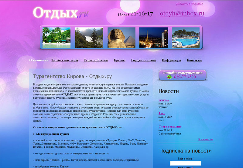 отдыхВ мае-июне 2010 года ИП Сметанин А.С. выполнял работы по созданию сайта для нашего турагентства «ОТДЫХ.ru». При выборе разработчика сайта, для нас, как для любого мелкого бизнеса, не на последнем месте была цена вопроса. Выбирая исполнителя, мы обнаружили, что дешевые сайты, сделанные за 3 дня не выдерживают никакой критики, а высокая цена сайтов, предлагаемых  дизайн-студиями, не гарантирует  внимательного отношения к пожеланиям клиента. На этом фоне соотношение цена/качество, предложенное ИП Сметаниным А.С., было оптимальным.