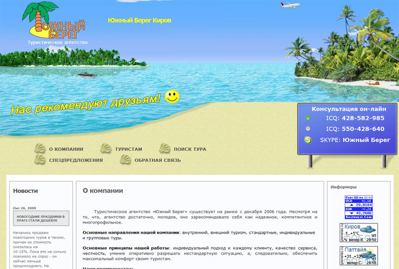 Так же созданный ИП Сметанин сайт турагентства «Южный Берег» в значительной мере поднял престиж фирмы, и выделил ее среди конкурентов.